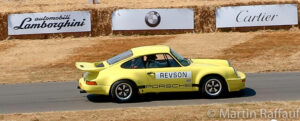Some of the entrants race up the hill to set a time and try and “win the hill-climb.” Others cruise up at a more leisurely pace, no doubt hesitant to push some of the cars that hard, as they are very valuable. Some are real showmen, and do donuts, spins, bike wheelies etc, and while some entrants drive their own cars, others hire pros to come in and drive. Porsche had brought in many of their former drivers to drive, such as John Fitzpatrick, Manfred Schurti, Derek Bell, etc.
