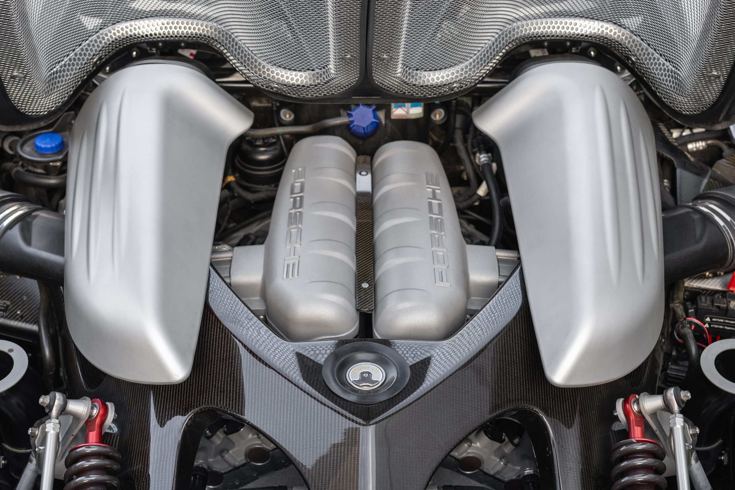 Aerodynamic engineering—three-piece belly pan, rear diffuser and an auto-deploy spoiler—yields nearly 900 lbs of downforce at 185 mph and helps the Carrera GT reach a 205 mph top speed, while the cockpit combines handcrafted leather, air conditioning, power windows and a Porsche Online Pro CD system for daily use.