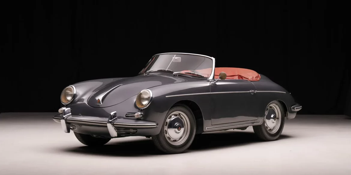 This 1960 Porsche 356B Roadster has been refinished in metallic gray over red leather and is powered by a 1600S flat-four paired with a four-speed manual transaxle. Features include a black soft top, 15″ steel wheels, a driver-side mirror, vent windows, body-color bumpers, an AM/FM radio, and front bucket seats....