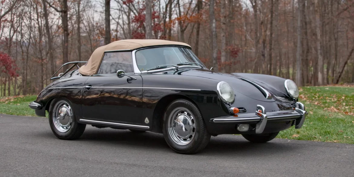 This 1960 Porsche 356B roadster has been refinished in black over tan leather and is powered by a replacement 1,750cc flat-four paired with a four-speed manual transaxle. Disc brakes have been fitted at all four corners, and additional equipment includes a tan soft top, a rear luggage rack, 15″ ventilated...