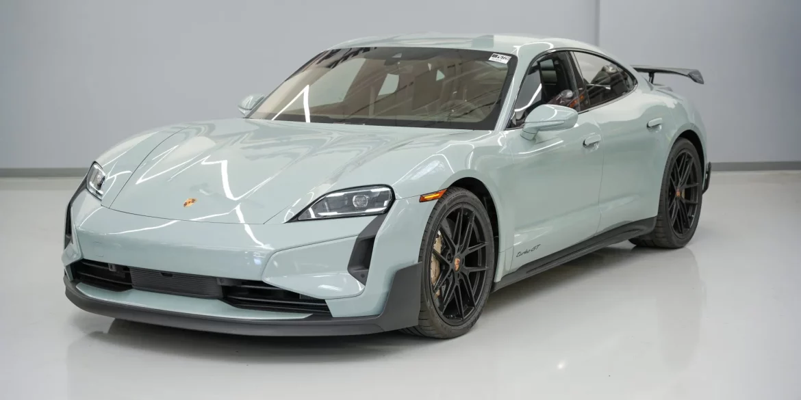 This 2025 Porsche Taycan Turbo GT Weissach is one of a limited number produced for the US market and is finished in Shade Green Metallic over black. The car is powered by two AC permanent synchronous electric motors, which drive the front wheels through a single-speed planetary gearbox and the...