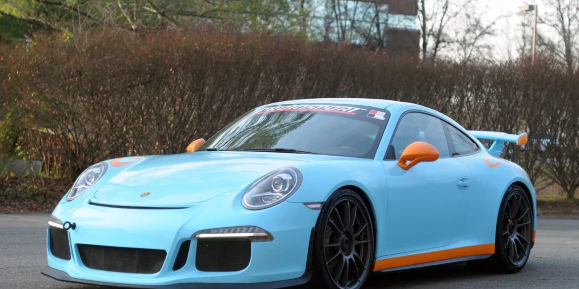 This 2014 Porsche 911 GT3 has received a replacement 3.8-liter flat-six and a seven-speed PDK dual-clutch transaxle under current ownership, and it has been modified with aftermarket exhaust and suspension components as well as 20″ O.Z. Racing wheels and a blue and orange exterior vinyl wrap that covers the white-finished...
