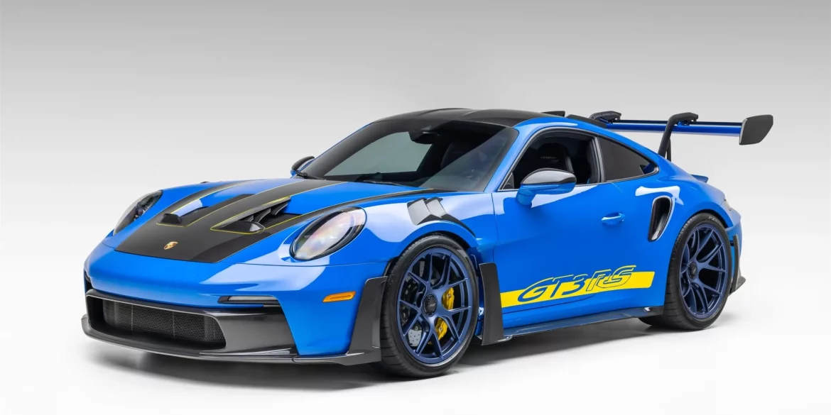 This 2023 Porsche 911 GT3 RS is finished in Shark Blue over Black leather and Race-Tex and is equipped with the Weissach Package, which reduces weight by utilizing a carbon-composite roof panel, front lid, anti-roll bars, and interior trim. Other equipment includes yellow GT3 RS graphics, carbon-fiber bucket seats, a...