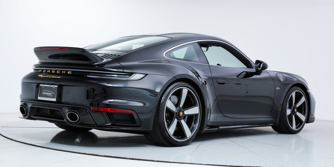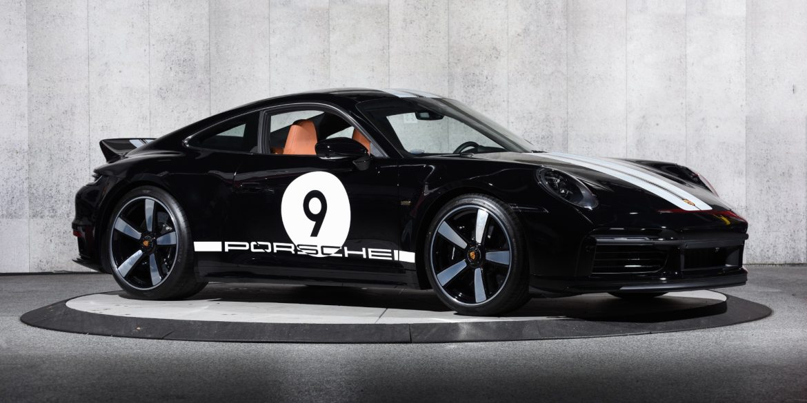 2023 Porsche 911 Sport Classic (992.1) 7-Speed Coupe: Swathed in Black with a body characterized by top twin stripes and side start number and PORSCHE decal over a Heritage Design Interior in Cognac Brown/Black leather upholstery that boasts Pepita seat and door inserts, Porsche crests on the headrests, Paldao wood...