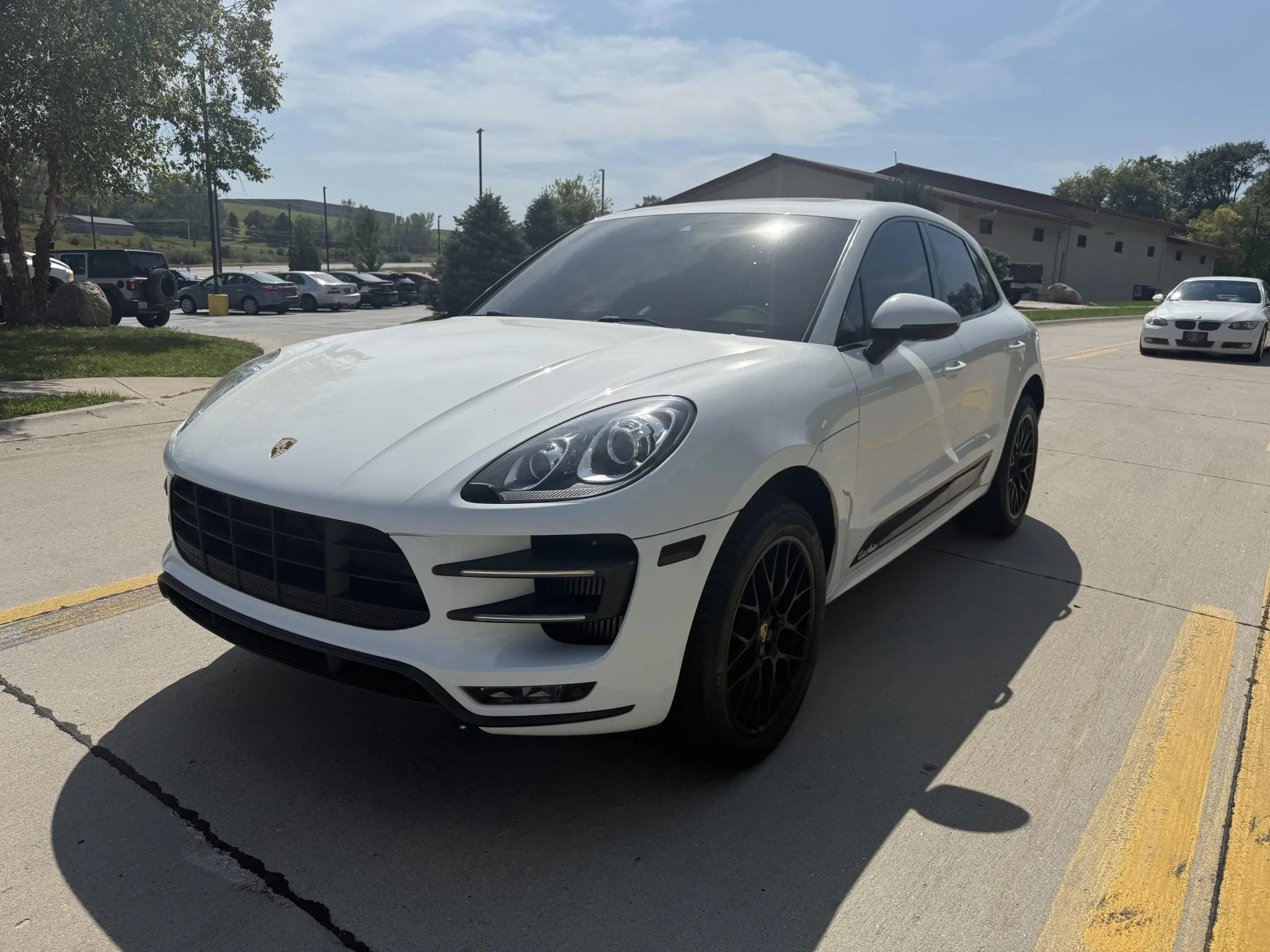 This 2016 Porsche Macan Turbo is finished in White over a Pebble Gray and Agate Gray interior and is powered by a twin-turbocharged 3.6-liter V6 that sends power to all four wheels through a seven-speed PDK transaxle and a PTV Plus differential.
