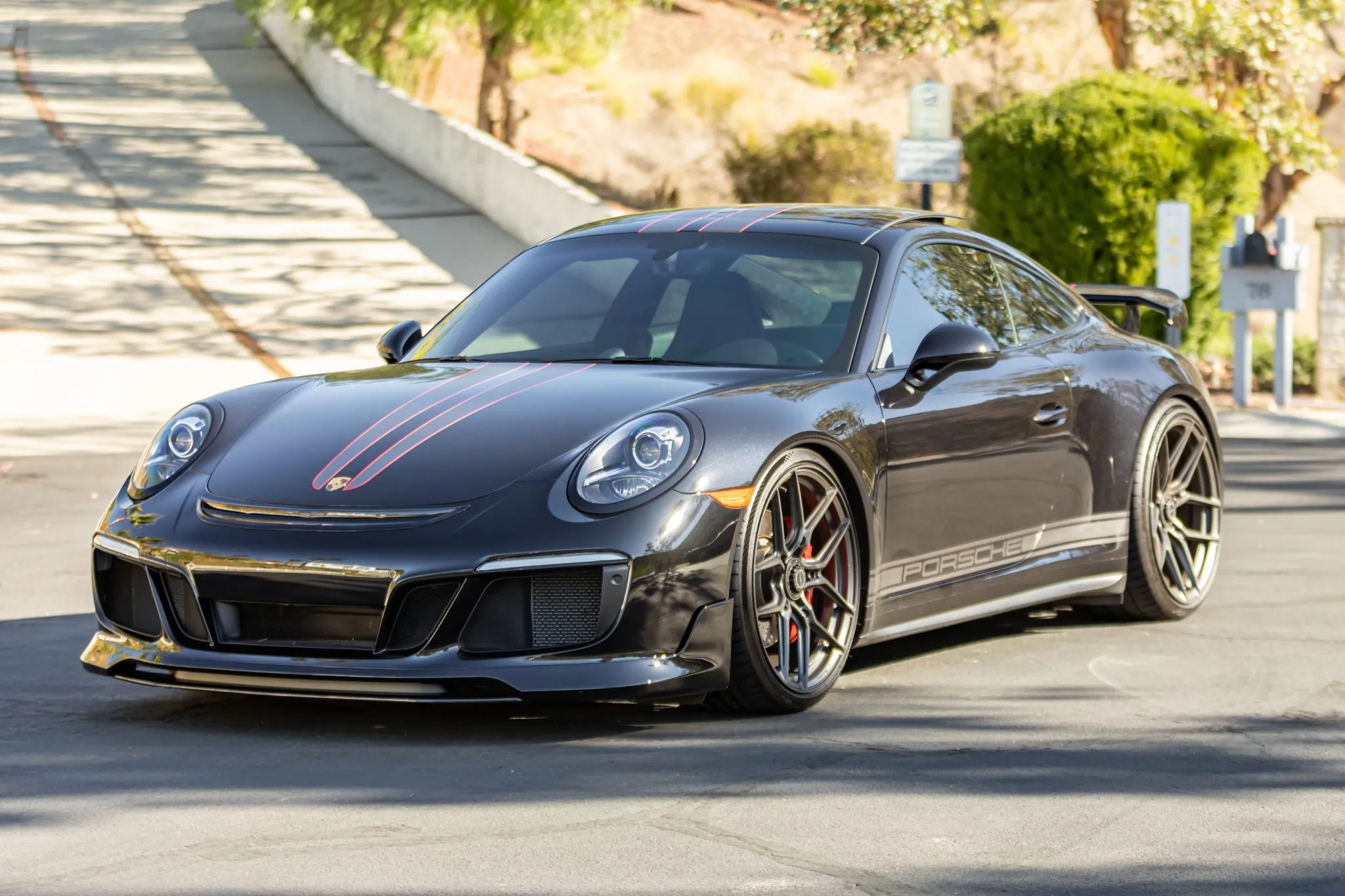 It is powered by a twin-turbocharged 3.0L flat-six paired with a seven-speed manual transaxle and is finished in Jet Black Metallic with dual stripes over black leather upholstery. The car is further equipped with the Sport Chrono Package, the SportDesign Package, the Premium Package Plus, a limited-slip differential, Porsche Torque Vectoring, a sunroof, ParkAssist, Power Steering Plus, rear-axle steering, a front-axle lift system, heated and ventilated front seats, a Bose sound system, and dual-zone automatic climate control.