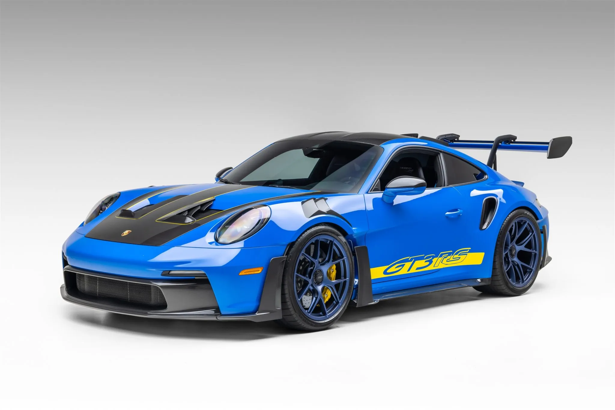 This 2023 Porsche 911 GT3 RS is finished in Shark Blue over Black leather and Race-Tex and is equipped with the Weissach Package, which reduces weight by utilizing a carbon-composite roof panel, front lid, anti-roll bars, and interior trim.