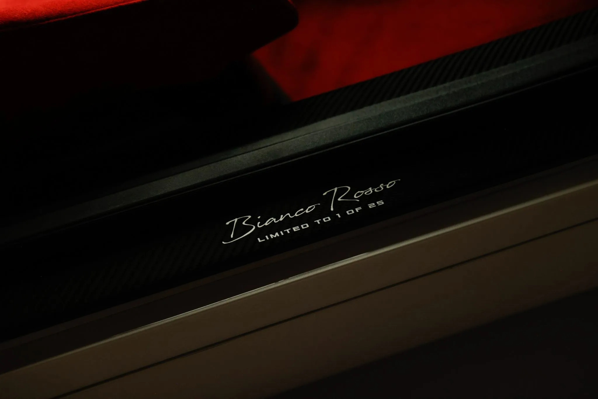 Inside, the Bianco Rosso Commission pairs exposed carbon fiber with red Alcantara and black leather. Carbon-fiber bucket seats provide excellent support and visual drama, while exposed sections of the carbon tub throughout the cabin serve as a constant reminder of the car’s engineering focus.