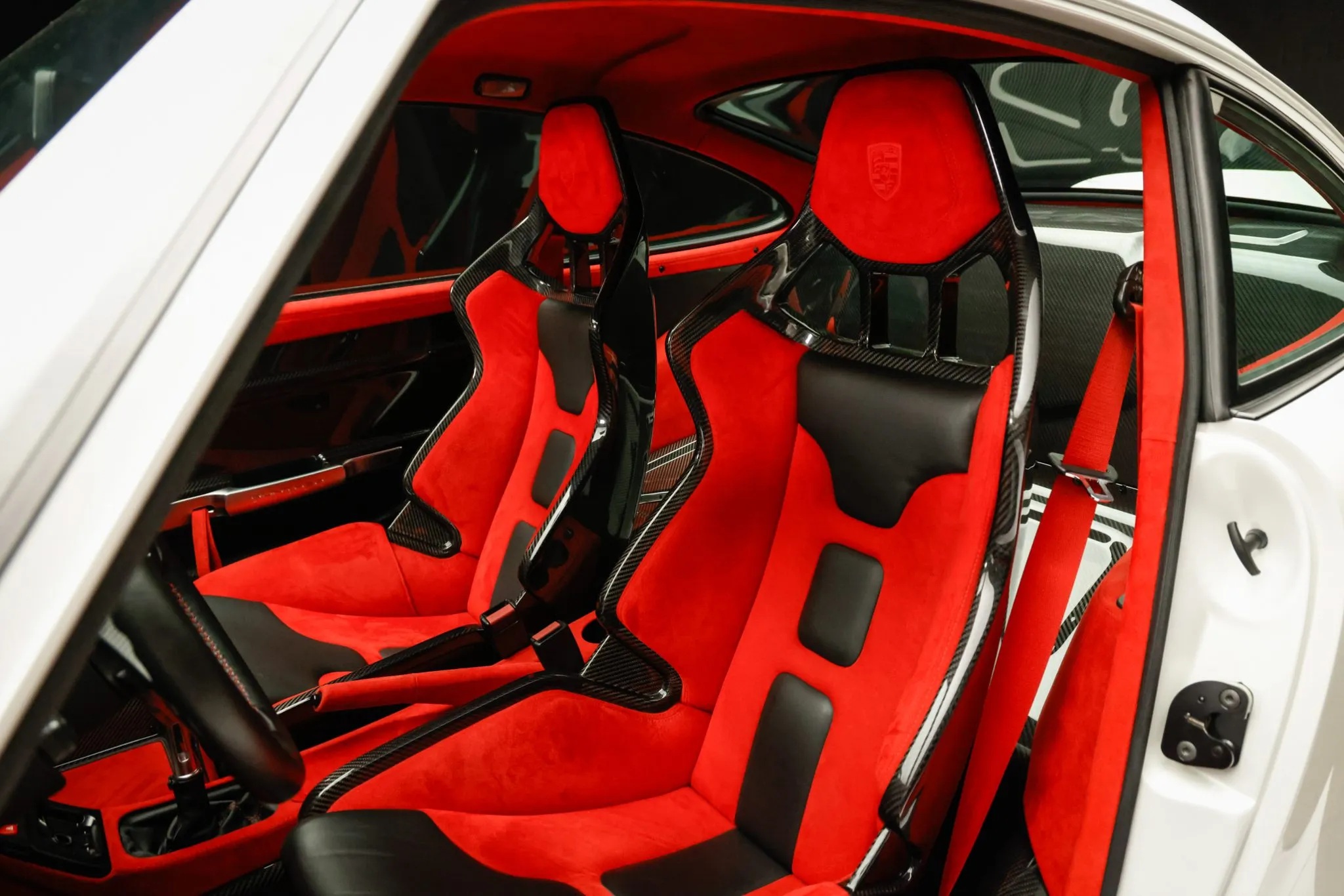 Production was capped at just 25 examples, and one is currently listed on Bring a Trailer, showing only 2,503 miles since completion. Known as the “Bianco Rosso Commission,” this car wears a pearlescent white exterior contrasted by red accents. It rides on Fuchs-style forged three-piece wheels backed by Brembo brakes with red calipers, with numerous design cues referencing classic 911s while maintaining a thoroughly modern silhouette.