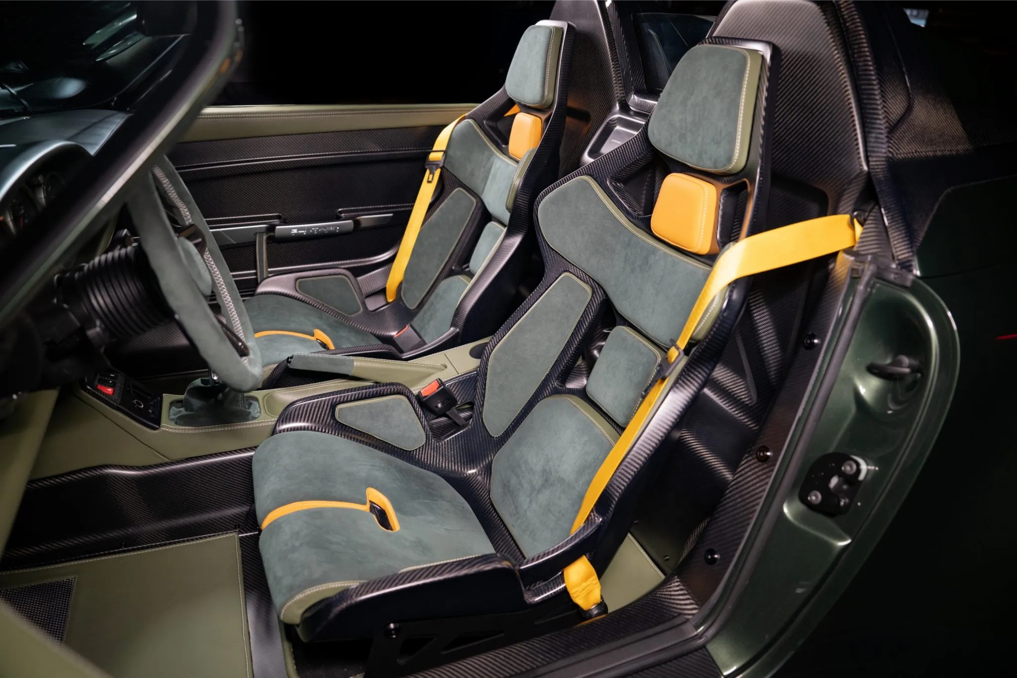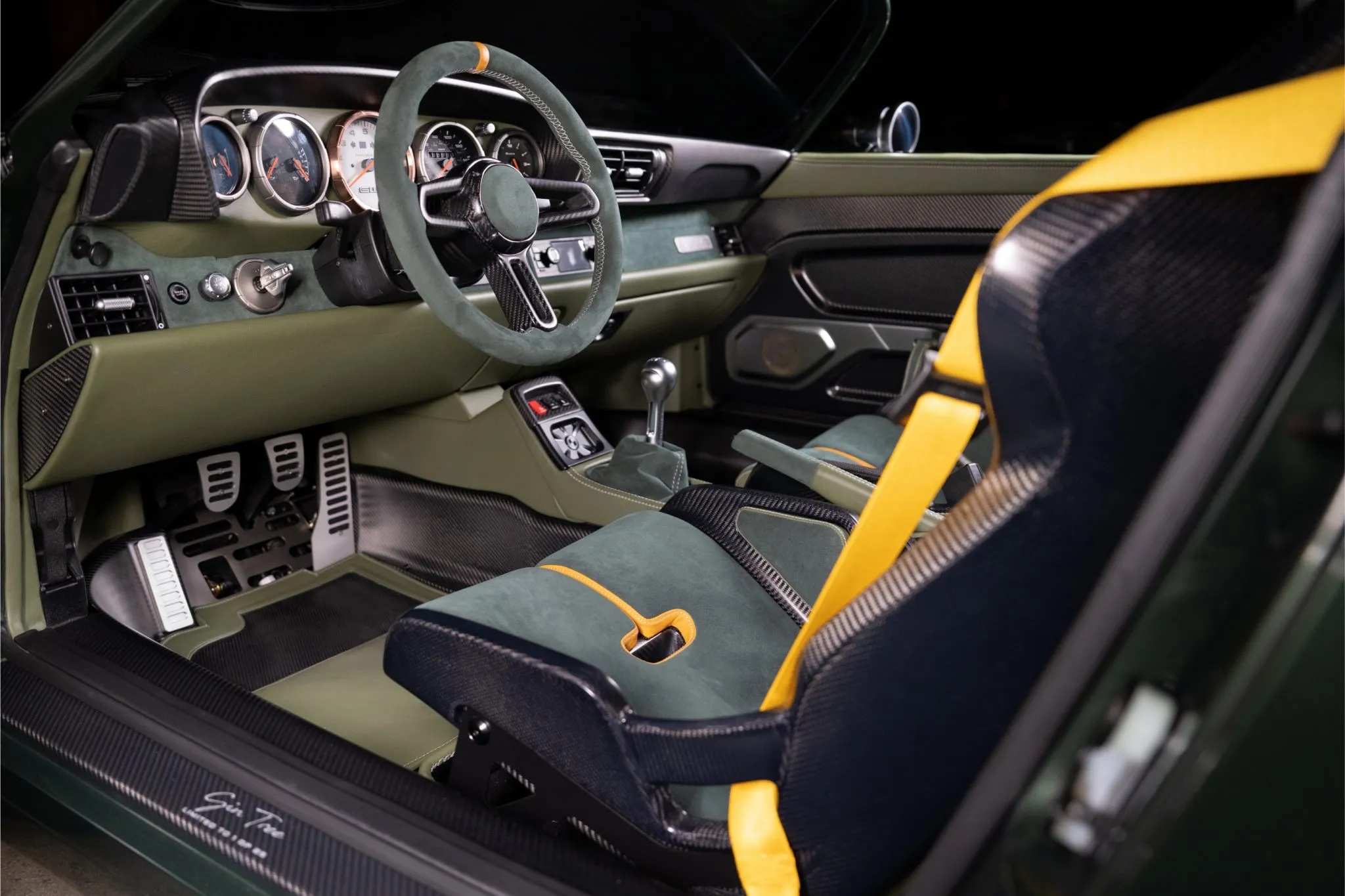 Exposed carbon fiber is visible throughout, joined by a slotted forged aluminum passenger footrest and pedals, green leather floor mats, leather and Alcantara door pulls, yellow seatbelts, automatic climate control, a milled aluminum shifter, and a Porsche Classic Radio.