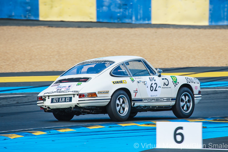 Covering the shortest period, Grid 4 accommodated race cars from between 1962-1965. This period saw Porsche take huge steps forward in the development of both its road and race cars as the 911 was introduced to the public in 1963 and the streamlined 904 broke cover in 1964. The 904 broke with the preferred construction method for Porsche’s racers up to that point, which had followed a space-frame construction with aluminium body panels. The 904 instead was constructed around a strong box-section steel frame with the lightweight fibreglass body panels bonded to the chassis. This new racer was to be powered at launch by the 6-cylinder engine from the 911 but the unit was not sufficiently developed for the rigours of motorsport. The 4-cam, 4-cylinder boxer engine of its predecessor was thus put into service once again, but was now increased to 1966cc. There were no less than four 904s in this class over the Le Mans Classic weekend. Following close on the heels of the 904 was the 906, which did get the 6-cylinder engine at launch, and here we were treated to a pair of 906s in this class. The top-finishing Porsche in Grid 4 was the #42 Carrera 6, or 906 as it was also known, in twelfth place overall.