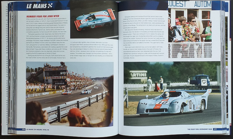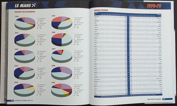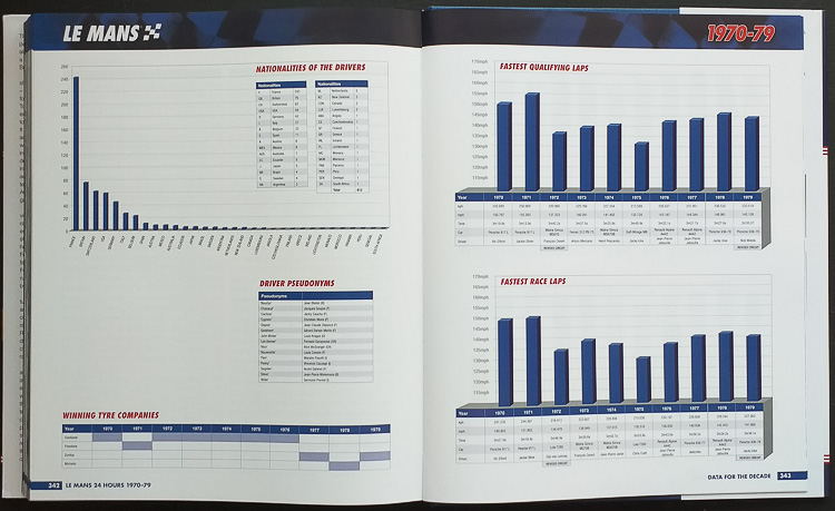 After each year’s summary, the reader will find informative and helpful tables and data relating to that year. At the back of the book are a number of very useful summaries, by year, showing driver stats, nationality of drivers, winning tyre companies, fastest qualifying times, fastest race laps, pie charts by year and much more. One interesting stat is the fastest speed through the speed trap which in 1971 was set by the Porsche 917 L at 225 mph (362 km/h). In 1978, this was equalled exactly by the Renault-Alpine A443 at precisely 225 mph (362 km/h).