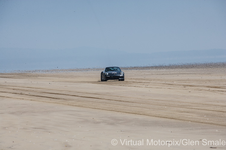 As Zef was readied for the run by his team, there was much arm-waving and talking into radios before finally, the Porsche was fired up and it made its way to the start line. The wind was blowing pretty hard by the time Zef was brought under the starter’s orders, and with an absence of fuss or formalities, the starter simply pointed down the beach with his radio, and Zef pulled away from the hastily-drawn start line in the sand, in an almost sedate manner. There was, of course, no point in doing wheel spins on the start line as that would simply have chewed up the sand, and sunk the Porsche up to its axles. Instead, Zef pulled away in a controlled manner and built up his speed progressively, increasing to his maximum entry speed at the start of the measured mile.