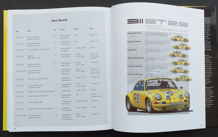 What also makes this 911 ST 2.5 so special, is the fact that it served as the camera car for the movie, ‘The Speed Merchants’ which was produced by the car’s owner and one of the authors, Michael Keyser (a DVD of the movie ‘The Speed Merchants’ is included in a pouch inside the back cover). In fact, in addition to his involvement as a racing driver in this car and film producer, Keyser’s life also included writing several other books. The background as to why his race team was known as Toad Hall Racing…, well you will have to read the book to find that out. The yellow 911 brought Keyser a number of victories, all of which can be found in the comprehensive Race Record at the back of the book.