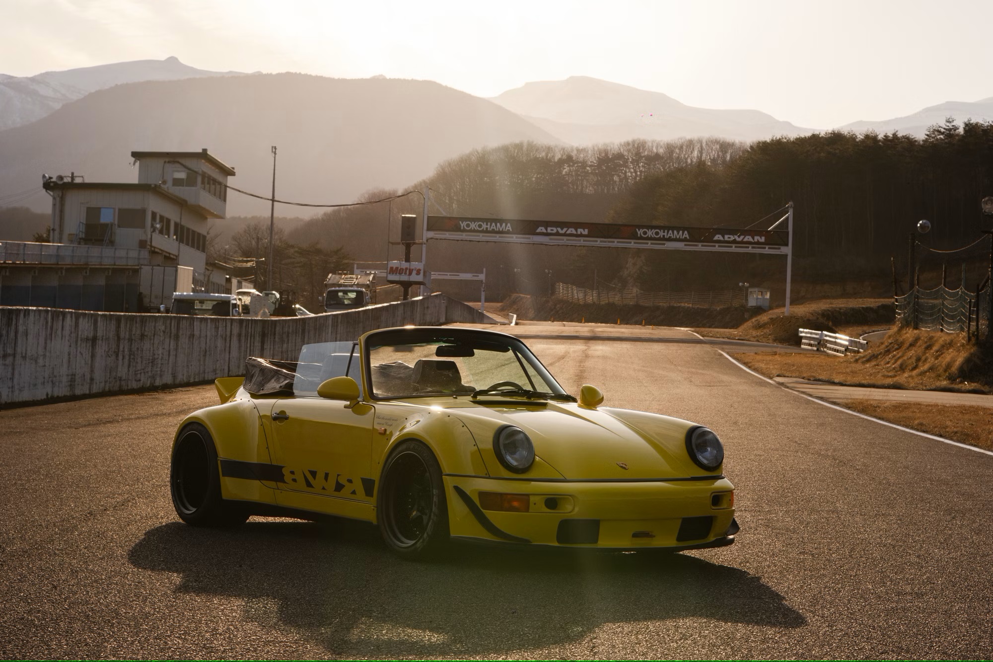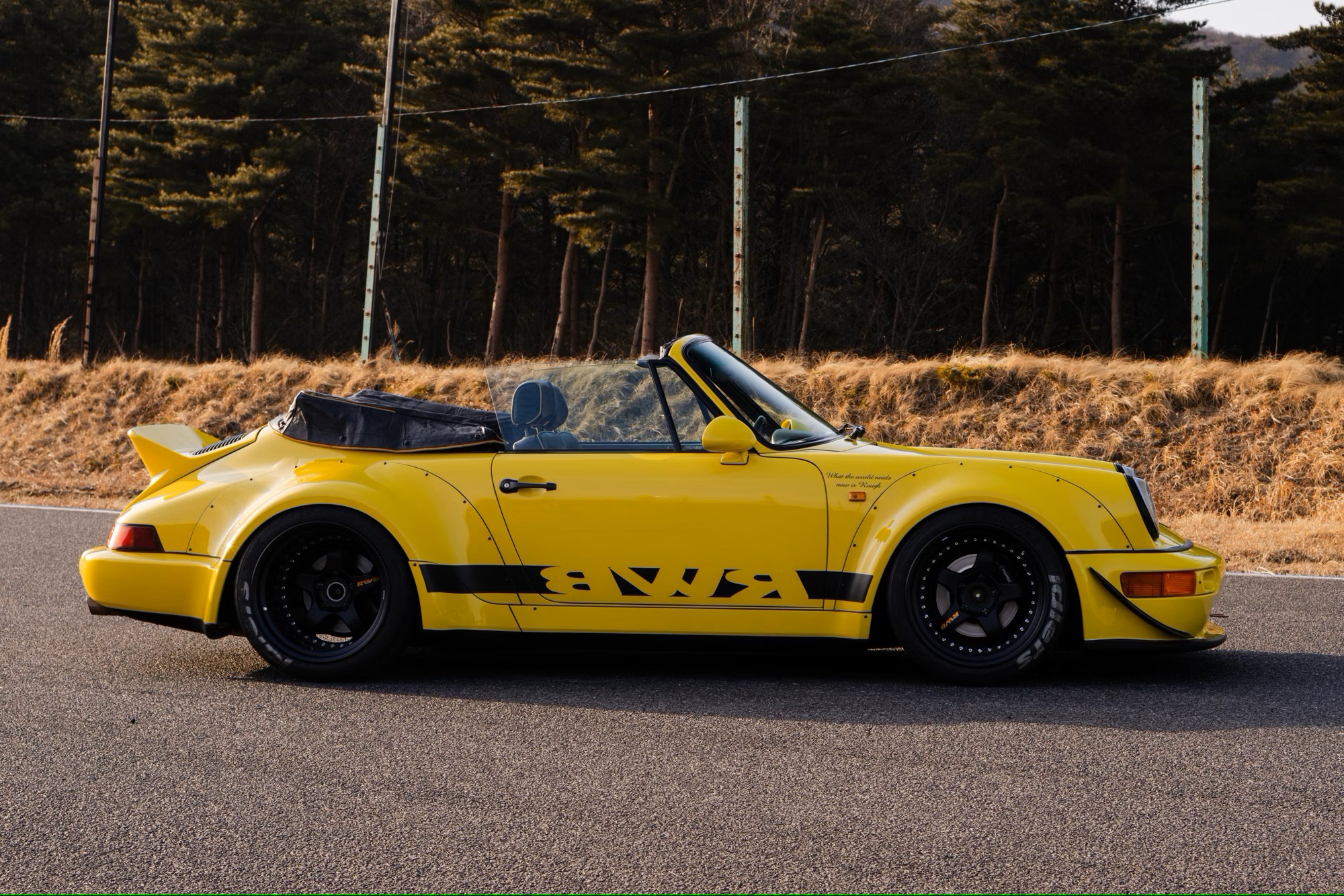 It is painted in yellow with a black convertible roof, ‘RWB’ side stripes, an ‘RWB Zweite Entwicklung’ spoiler decal, and ‘What the world needs now is Rough’ quotes on the front wings. The car rides on aftermarket 18-inch 10.5J front and 13J rear five-spoke split-rim alloy wheels finished in matte-black, with Nankang Sportnex CR-S tyres.