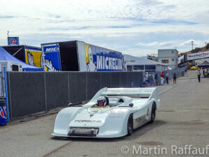 The Porsche tractor race was a big hit with fans. There was a Le Mans start on the start/finish straight and the tractors ‘raced’ over to turn 5 at Laguna Seca. Thank goodness, they did not make them navigate the corkscrew! The Gunnar tractor however had a big handicap, as it was dragging around a cart with a bunch of small kiddie tractors, all painted up in the ‘Pink Pig’ 917-20 paint scheme. John Oates (of the rock group Hall & Oates) drove this tractor on Saturday, and Justin Bell drove it on Sunday. Although we did not win, the Gunnar tractor did win the award for best tractor! Kevin Jeannette had once again hit a home run with his tractor preparation!