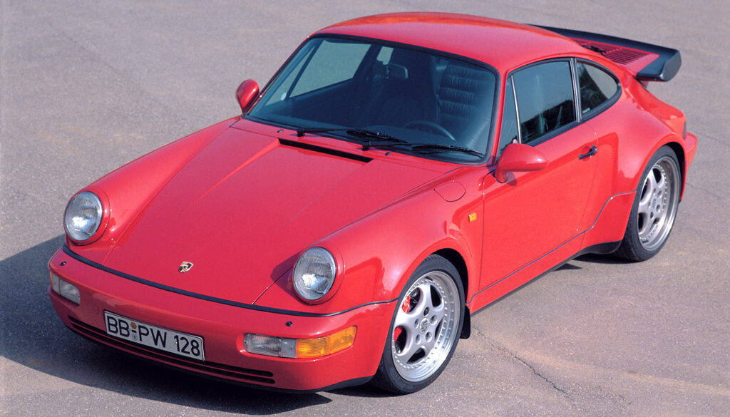 The 1989/90 change of model year saw the launch of the Porsche 911, 964 series onto the market. This 911 model was initially available as a Coupe, Targa and Convertible. From model year 1991 onwards Porsche also introduced its top-of-the-line model - the Turbo - into this series. In spite of bearing a major similarity in terms of look to the naturally-aspirated model, the extended wings remained. This meant that the new Porsche could retain its turbo look. The 964 Turbo model was the successor to the Porsche 930. The 964 Turbo was the end of an era, the last of the single turbo rear-wheel drive 911 Turbos.