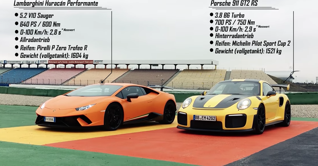 Porsche 911 GT2 RS vs Lamborghini Huracán Performante Track Battle Onboard sport auto-Testfahrer Christian Gebhardt im Porsche 911 GT2 RS und Lamborghini Huracán Performante. Erster Vergleichstest auf dem Kleinen Kurs Hockenheim. Rundenzeiten: Porsche 1.03,8 min, Lamborghini: 1.05,5 min....