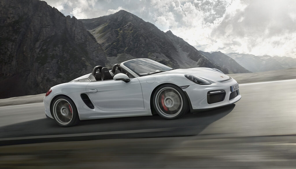 Following in the footsteps of the nineteen fifties and sixties 356 Speedsters, 550 Spyders, different 718 Spyders and the two thousand ten Boxster 987 Spyder, the Boxster 981 Spyder is by far the most powerful of them. The power-to-weight ratio of the original 718 Spyder 1.7- and 2.0-litre 4-cylinder models was better though already 55 years earlier. Visually the Porsche Speedsters and Spyders are characterized by their unique side view silhouette - the result of the low windscreen and low roofline when the temporary canvas top is fitted.