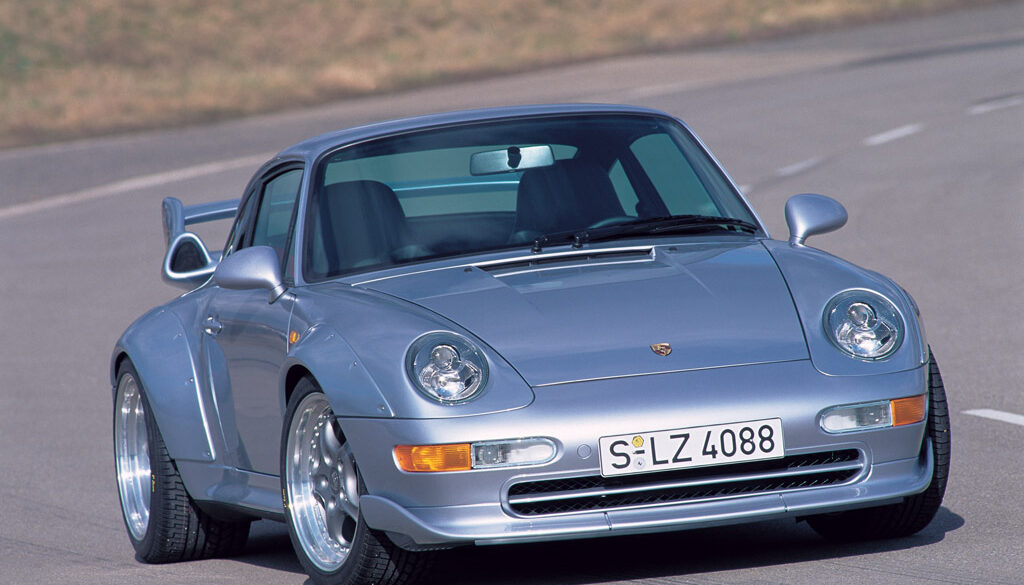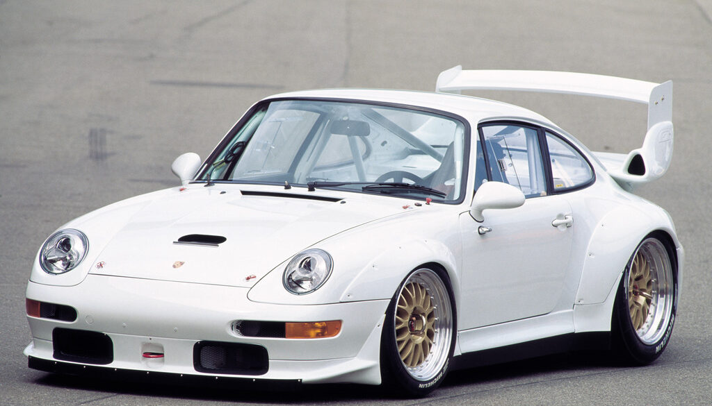 The Porsche 911 GT2 Evo represented the top specification ever produced for any air-cooled Porsche. Designed to compete in FIA GT1, it incorporated a twin turbocharged 3.6L flat-6 engine rated at a full 600 HP and 491 lb-ft of torque. As compared to the standard 993 GT2, Porsche widened the rear fender extensions to cover wider modular wheels and added a new front spoiler with inlets for oil and brake cooling. A second deck appeared on the already outlandish rear spoiler, which could be mounted higher in the air stream for added downforce. Approximately 11 samples were produced.