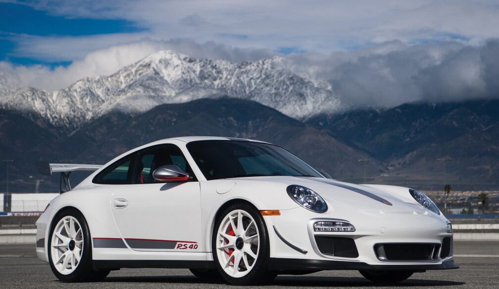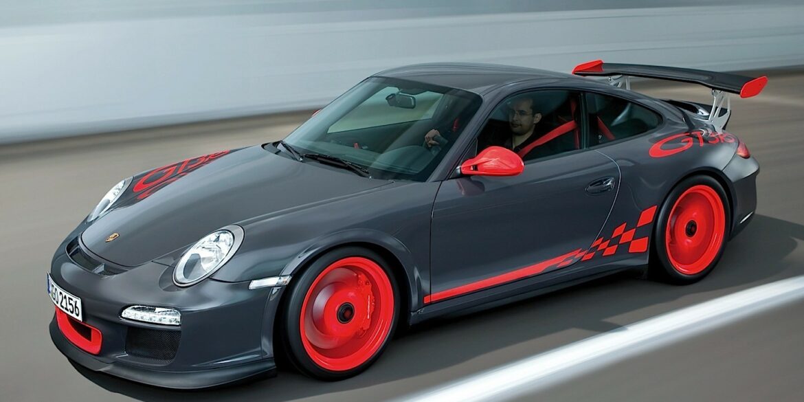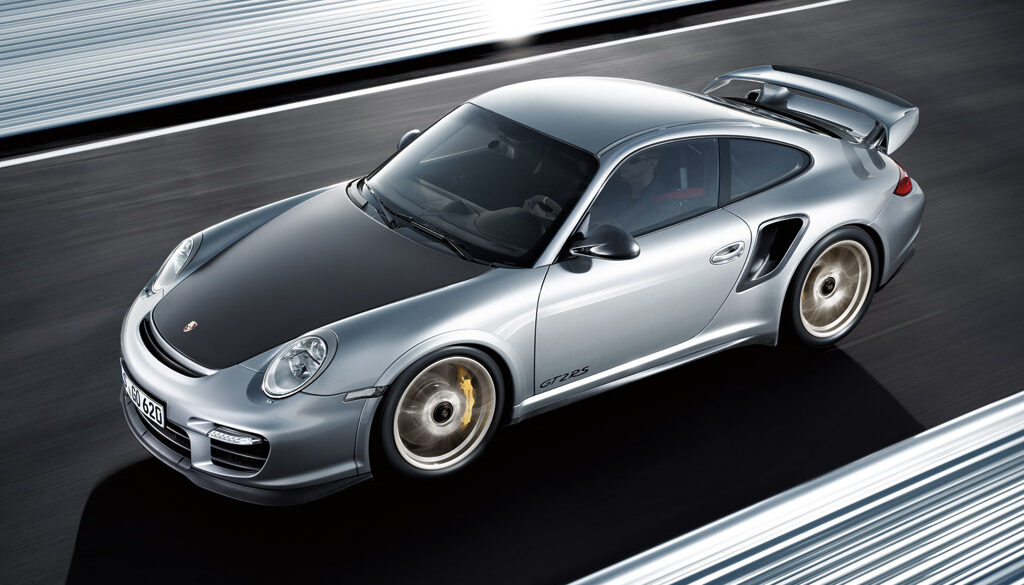 The 997 911 GT3 RS is an even lighter and more purist version of the 911 than the regular GT3. 20 kilograms lighter than the GT3 and equipped with a close-ratio six speed manual the GT3 RS gets to 60 mph 1/10th of a second faster than the GT3. The 911 GT3 RS is 44mm wider at the rear than the GT3. The wider track helps improve directional stability when cornering. Weight savings can be found throughout the car. The Clubsport version there is a bolted roll cage, a six-point harness for the driver and a built in fire extinguisher.