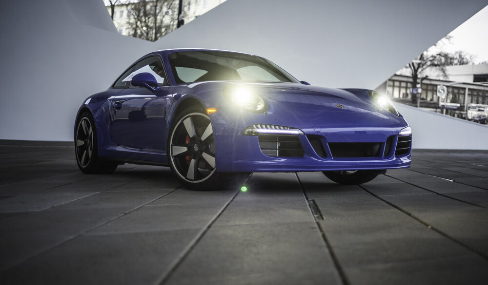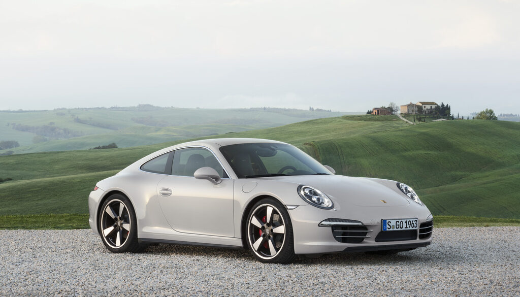 The 2014 50th Anniversary Edition 911 was built by Porsche to commemorate the 911’s birthday, 50 years after its production launch in 1964. In homage to 1963, the year the 911 debuted at the 1963 Frankfurt Motor Show, production was limited to 1,963 units. The 50th Anniversary uses the wider body from a Carrera 4S (but remains only rear-wheel-drive) and is lower than a standard Carrera by 10mm. The 20 inch-alloys are a modern take on the original Fuchs wheels, and the seats are finished in “Pepita” cloth. Includes Porsche Active Suspension Management (PASM), sports exhaust and powerkit tickled 430 hp flat six.