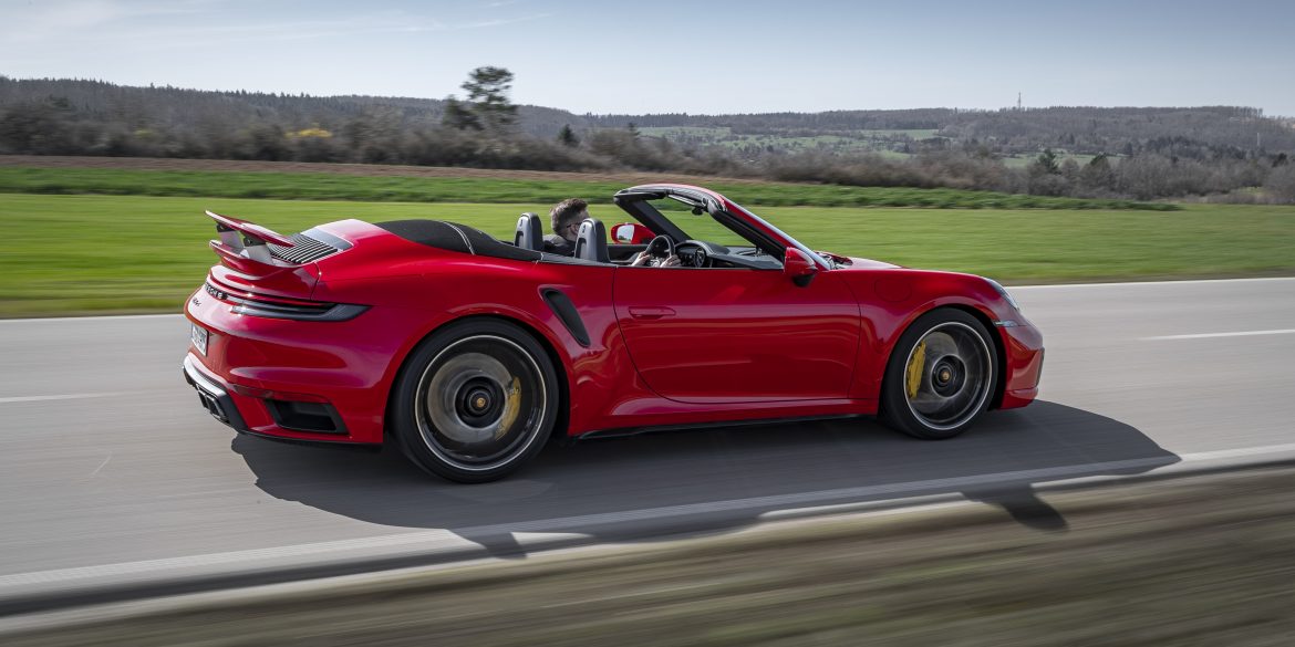 The 992.1 Porsche 911 Turbo S Cabriolet is a formidable beast. The new Turbo S comes with an all-new, 3.8 liter boxer six with two variable turbine geometry (VTG) turbochargers. The power output is a staggering 640 hp and 590 lbs-ft of torque. In keeping with previous Turbo models, the engine powers all four wheels. A new 8 speed automatic transmission with a manual mode manages the power, and can power the car to 60 mph in a hair under a claimed 2.7 seconds.