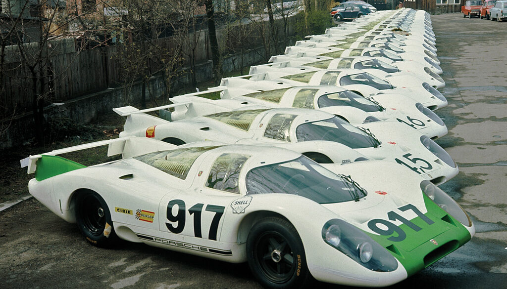 The 917 Kurzheck Coupé (917K) first appeared in 1970 and contributed more to the Porsche 917 story than any other variant. It was a high-down force version that featured a cut-off tail for increased downforce. This reduced the cars top speed, as much as 30 mph. Le Mans winner 1970, Interserie winner 1970 and Manufacturers' World Championship for Porsche in 1970.