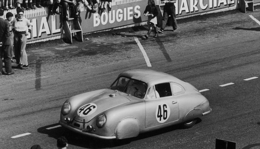 In 1950, eleven remaining Gmund chassis were assembled after the factory returned to Germany and converted to SL (Sport Leicht) racing specification. They received 1,086-cc engines, enlarged fuel tanks, louvered quarter-window covers, wheel spats, streamlined aluminum belly fairings, and a pedestal-mounted shifter. Three Type 356/2 cars raced at Le Mans in 1951; two crashed, but 356/2-063 performed flawlessly, winning the 1,100-cc class.