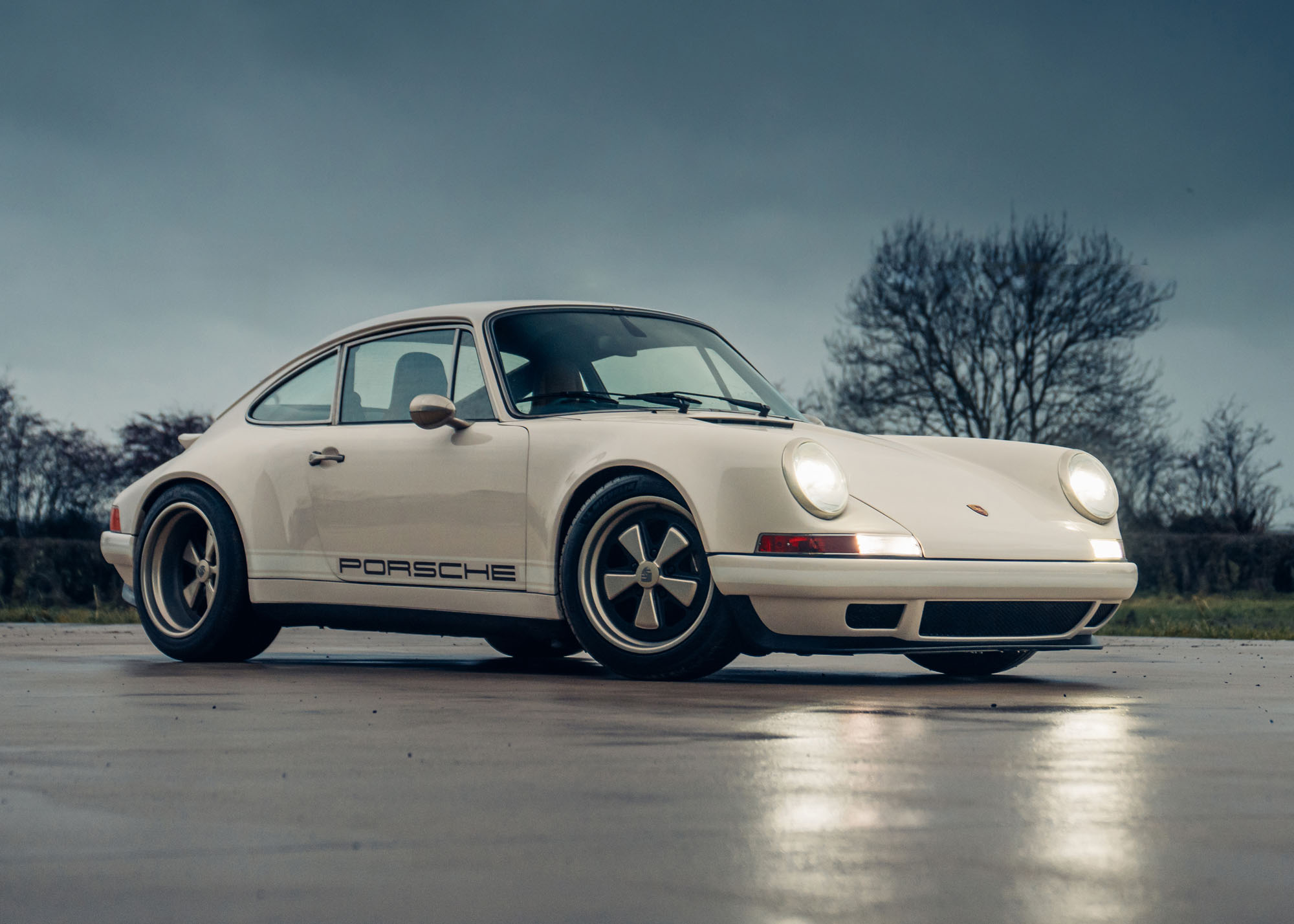 The build features other carefully integrated aesthetic details which elevate the whole. There is matching champagne detailing for the wheels, rear-engine cover grille, mirrors and headlight rings, while the glasshouse brightwork features Theon’s contemporary Polished Eclipse Chrome finish. Distinctive Copper Brown metallic brake calipers add a further dash of color, matching the painted text of elegant PORSCHE script on the doors and engine lid, and gently evoking a ‘70s aesthetic. The calipers are nestled behind bespoke 17-inch Fuchs-style wheels, which are lightweight three-piece split rims finished in champagne, filling the sculpted arches perfectly. The result is a cohesive, beautifully resolved machine that combines classic minimalist elegance with modern performance capability.